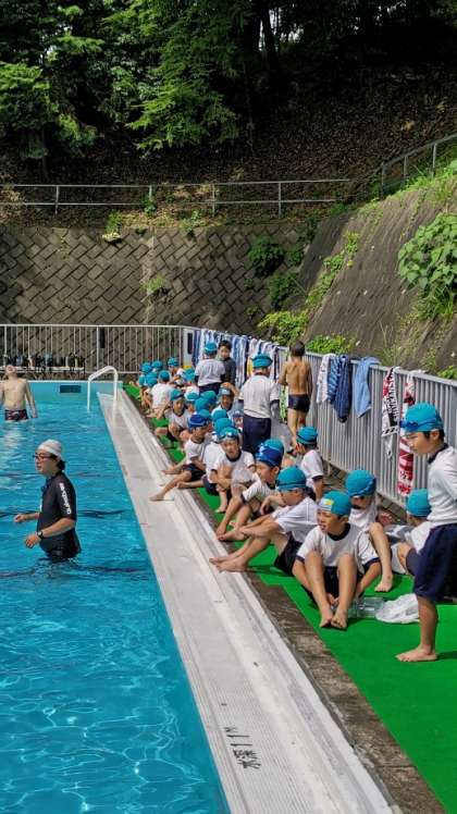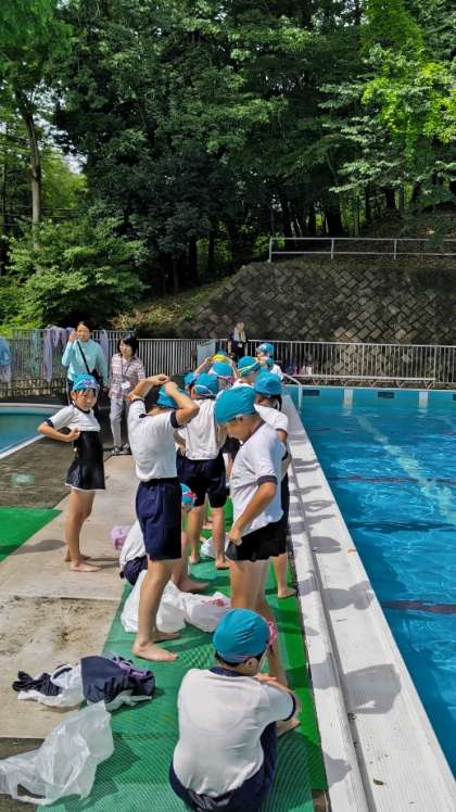 (水慣れをしてから、いよいよ水着の上に体育着を着ます)