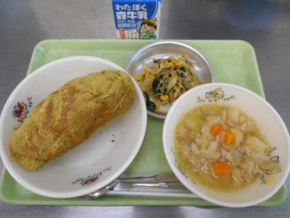 9月8日が「桑の日」とのことで、今日は桑の葉粉を練りこんだパンを使用した揚げパンでした。まわりについているきなこにも桑の葉粉ををいれて、緑色になっています。