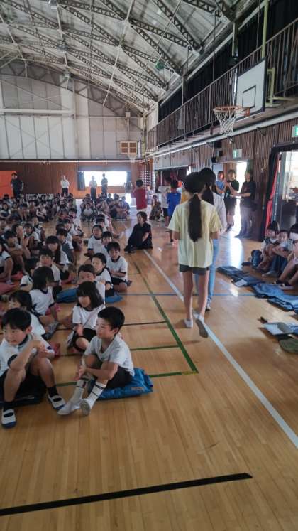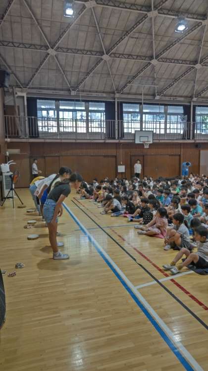 (曲に合わせて打楽器でリズムをとりながら、体育館を回ります。最後に「よろしくお願いいたします!」)