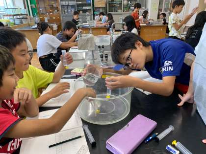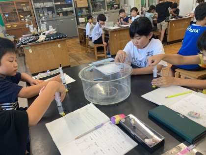 実験内容・方法を理解したら、予想を立てます。結果は空気と同じでしょうか? それともちがうでしょうか? 子どもたちは空気のときの実験を思い出しながら予想を立てました。結果は…。「ん?」「あれ?」どうでしたか?