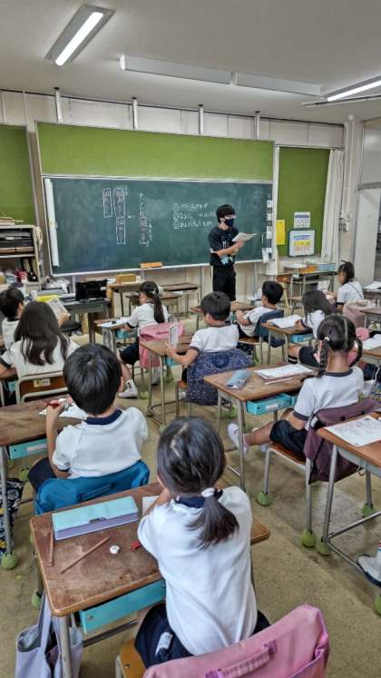 (2年生の教室では、漢字テストが始まる前のようです。最後の確かめをみんなでしています)
