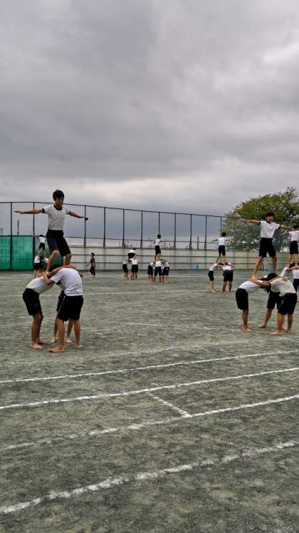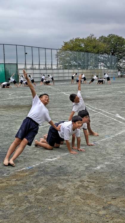(曇り空で、今にも雨が降りそうな感じです。でも子どもたちは一生懸命です)