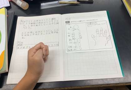 4年生は「ヒトの体のつくりと運動」の学習に入りました。ヒトとは、まさに子どもたち自身です。ここでは人体骨格模型や写真、動画などの資料を活用しながら学習を進めていきます。その中で、最も身近で体のつくりや運動を感じることができるものは自分の体です。自分の体を触ったり、動かしたりしながら体のつくりや運動がどのようになっているのかをイメージしながら学びます。