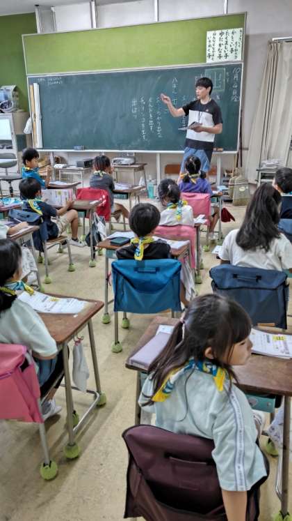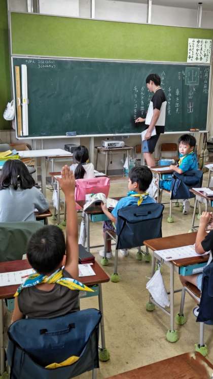 (1年生が漢字の学習をしています。「出」という字ですね)