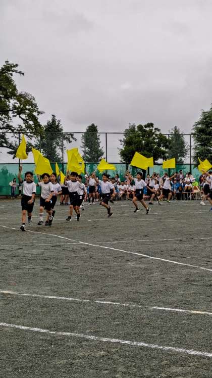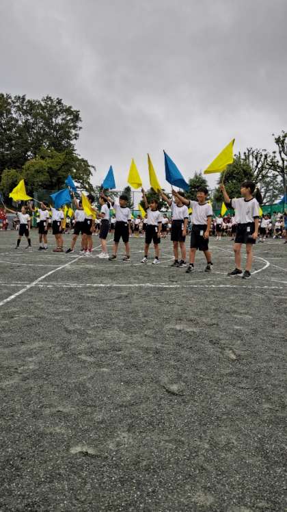 【4年生表現】「FLAG〜心を一つに〜」です。青と黄色のフラッグをたなびかせて、かっこよく入場します。