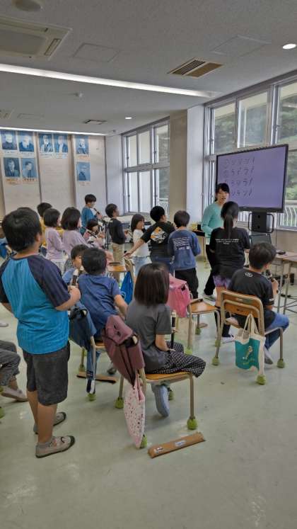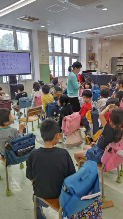 3年生がリコーダーの練習をしています。「ラ」と「シ」と「ド」の音を組み合わせて吹いています。