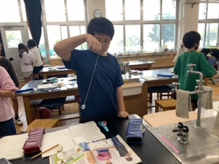 そこで、今日は実際に自分で自由にふりこを作ってみました。凧糸とビー玉を使って一人一つ作りました。ふりこは、常に一定の時間で往復します。自分が作ったふりこと友達が作ったふりこは同じ動きをするのかしないのか。子どもたちはふりこの動きを見ながら、凧糸の長さを変えてみたり、手を離す位置を変えてみたり、ビー玉の大きさを変えてみたり、といろいろ試していました。その時の子どもたちの表情は真剣そのものです。