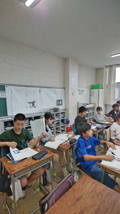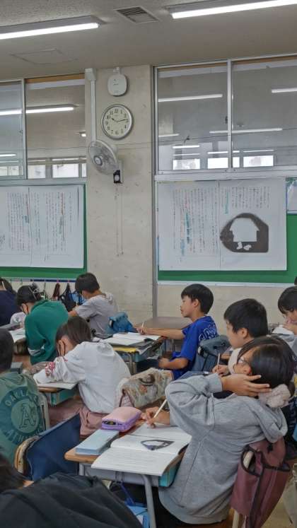 (教室のまわりには、物語の文章が拡大コピーして貼られています)