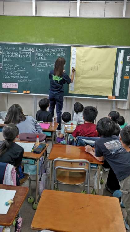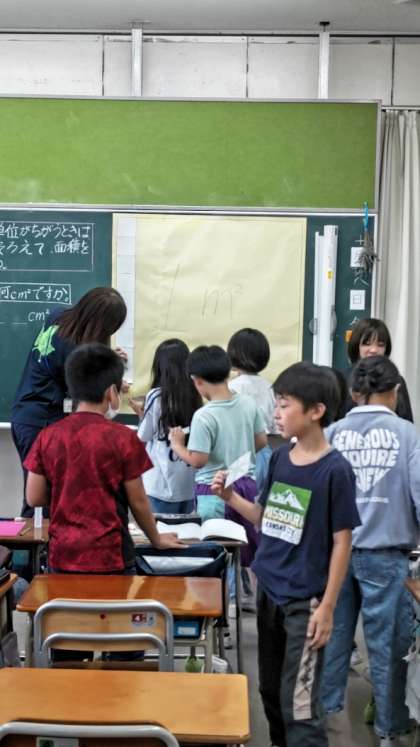 (黒板に1平方mの実際の大きさを貼り、量感を捉えます)
