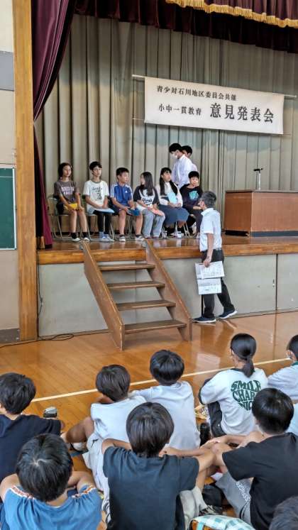 青少対石川地区共催「小中一貫教育 意見発表会」が、石川中学校で行われました。昨年度までコロナ禍によりリモート開催等で行われてきた期間が続きましたので、このような完全な形での開催は久し振りです。