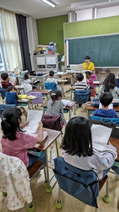 先生のシンセサイザーに合わせてみんなで歌っています。「おはようのエール」という曲のようです。歌詞の紙を見ながら歌います。