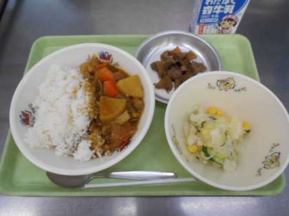 今日は「はちおうじ読書週間」にあわせて「ひみつのカレーライス」の絵本にでてくる料理を給食にしました。