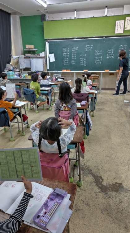 「かけ算九九」のきまりを確かめているようです。「九九の中で答えが8になるのは?」「答えが16になるのは?」「24になるのは?」