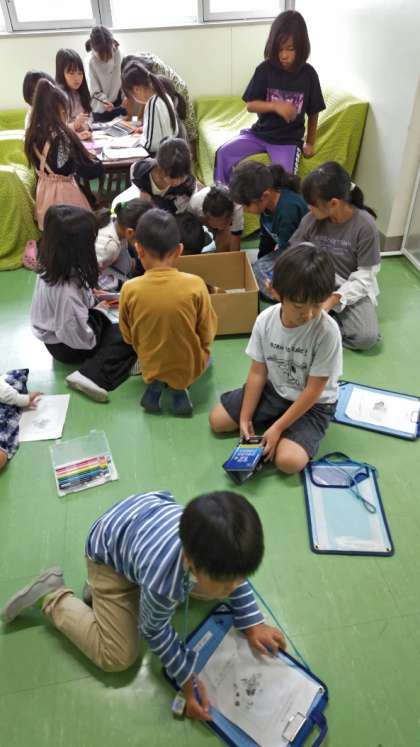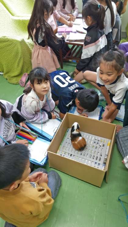 休み時間は子どもたちに囲まれているモルモットのチョコちゃんです。今日はダンボール箱に入っていますね。