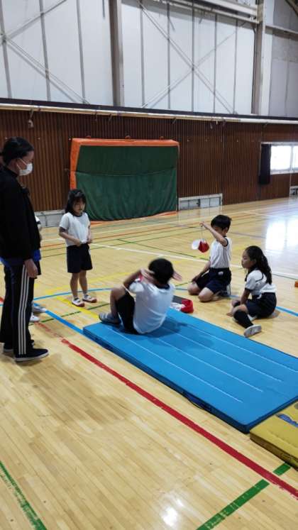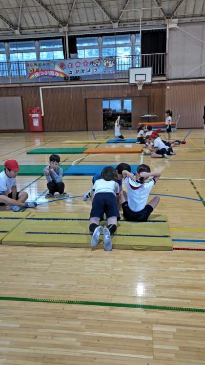 このところ半日出張が続き、午後からの授業まわりとなっています。すみません。3年生が体育館でマット運動をしています。「後転」ですね。