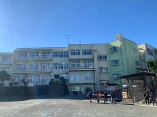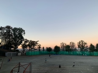 下の写真は、小宮小の校舎内から見た朝の空と日の入り前の写真です。空の色がとてもきれいだったので、写真に撮ってみました。夜には細い月がきれいに見えました。