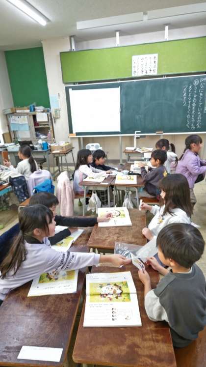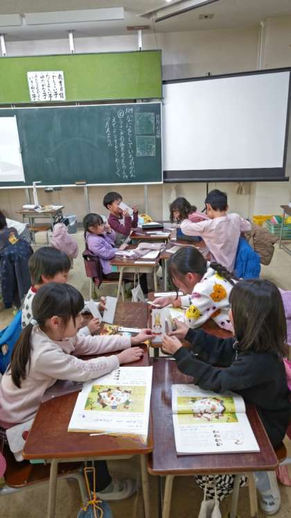 1年生の教室が楽しそうに盛り上がっています。「えをみて つたえよう」の学習です。みんな、教科書に載っているうさぎの大家族のイラストを見ています。
