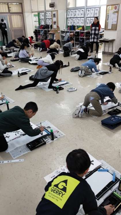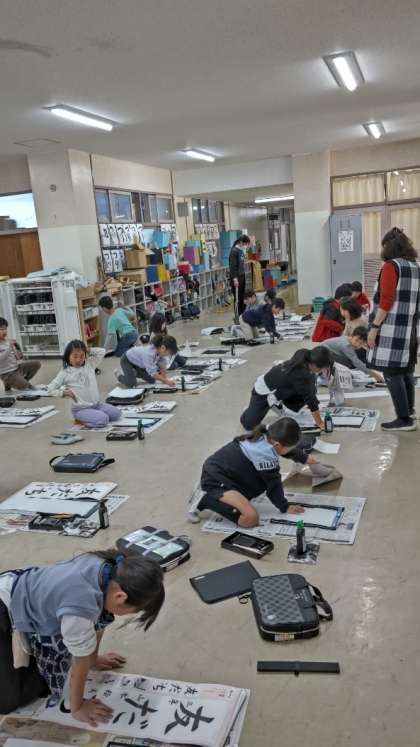 3年生が初めての毛筆による書き初めを練習しています。オープンスペースを活用します。大きく「友だち」と書いています。
