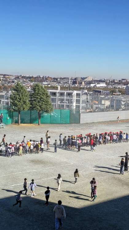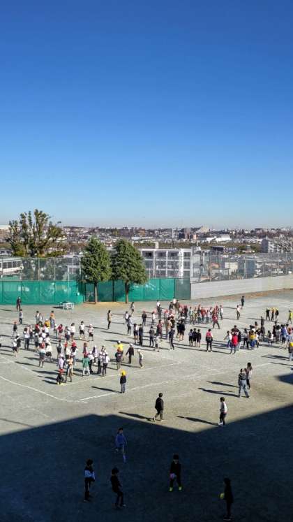 よく晴れた中休みの校庭です。今日は2年生と3年生のドッジボール大会が行われています。1回戦ですね。写真右側が3年生、左側が2年生です。