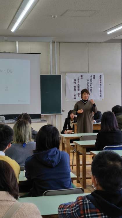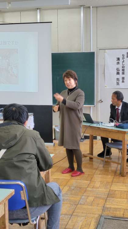 (授業公開後は、家庭科室で講演会を行いました。講師の先生から「やる気を引き出す子どもとの関わり方」のお話をいただきました)