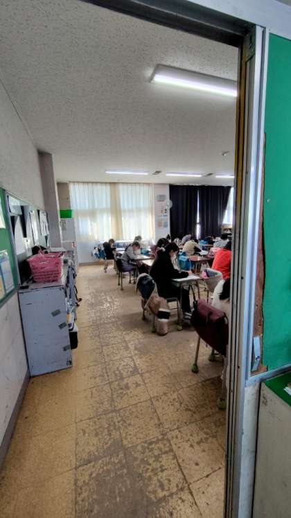 (検定開始後は邪魔にならないようオープンスペースから・・・がんばって!)