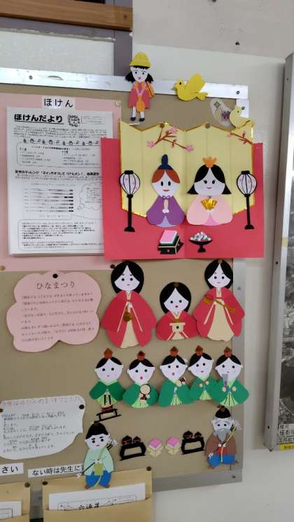 職員室前の廊下に、きれいなおひなさまの飾りが貼られています。