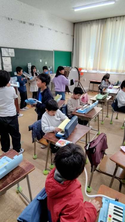 鍵盤ハーモニカに大だいこと小だいこを合わせながら演奏します。まずはそれぞれがグループごとに練習しています。
