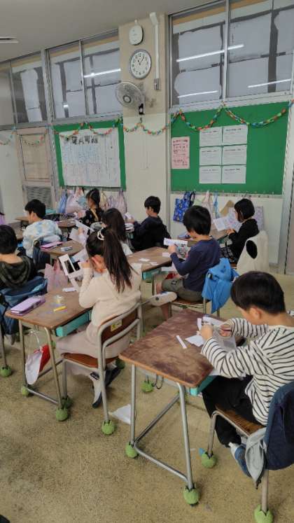 (子どもたちが切っているのは、方眼紙に印刷された四角形6つ)