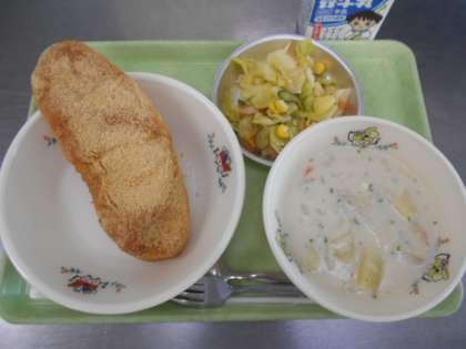 今日はすきなもの給食で主食部門1位になったきなこ揚げパンがメインとなった給食です。