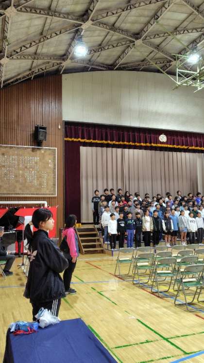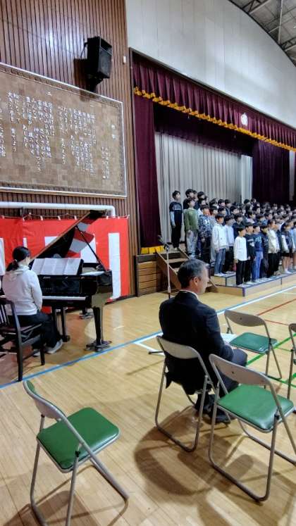 (卒業生と5年生が気持ちを合わせて歌います「旅立ちの日に」)