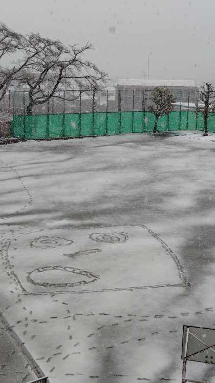 (早く登校した子が、校庭に顔を描いたようです)