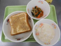 -献立-セサミトーストクリームシチューわかめサラダりんごジュース気温が下がったた...