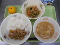 -献立-ごはん豚肉の生姜焼きじゃがいものみそ汁じゃこと野菜の彩り和えみかん牛乳豚...