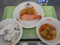 -献立-わかめごはん鮭の塩焼き肉じゃがごま大根牛乳11月11日は「鮭の日」です。...