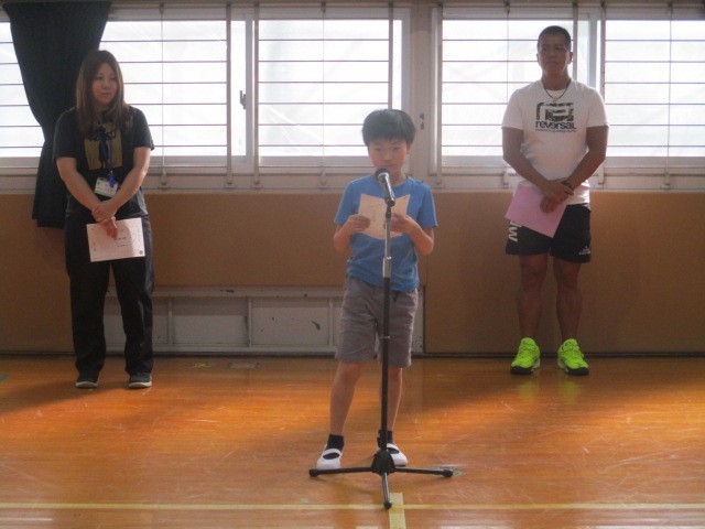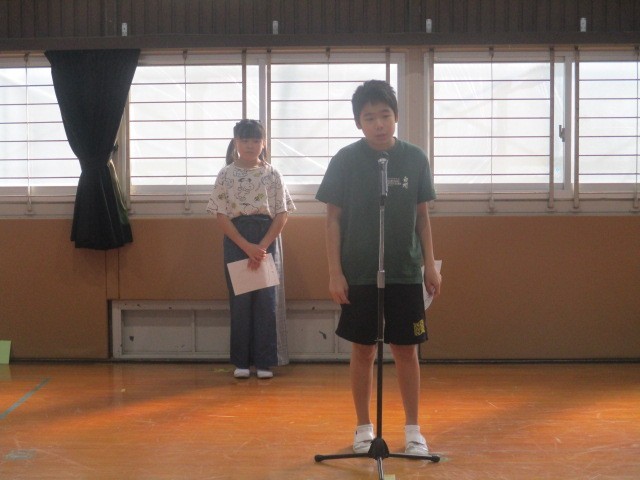 なかよし班ごとの発表となりました。1年生にとっては、「ことば朝会」のデビューとなりました。