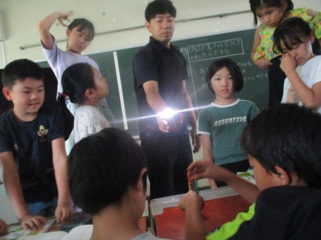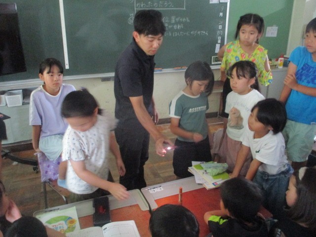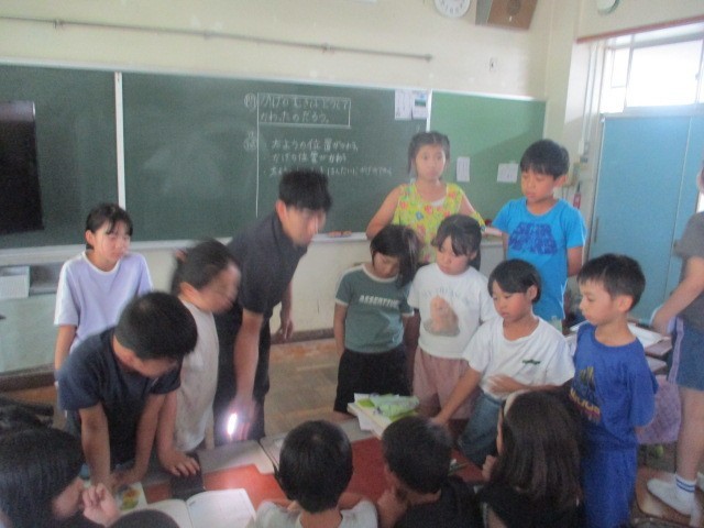 理科の時間でした。太陽の動きと影のでき方について、教室で学んでいました。校舎の前には、日時計もあります。