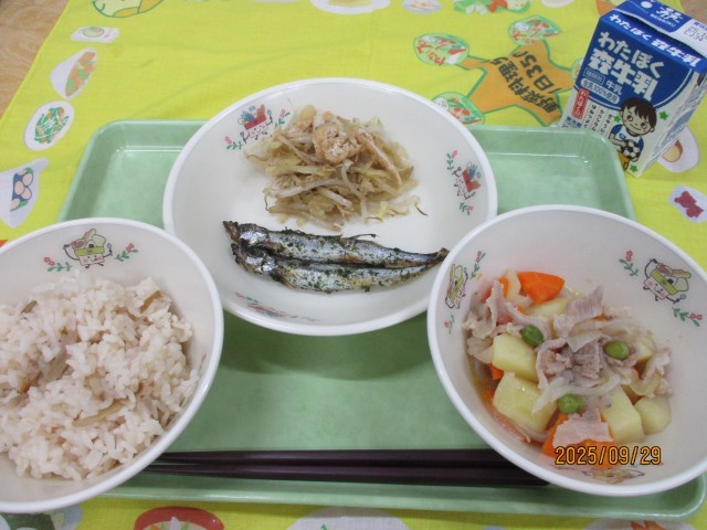 八王子ショウガごはん シシャモの磯辺焼き 塩肉じゃが キャベツと油揚げのごまあえ 牛乳