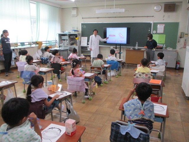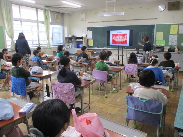 歯科校医の先生に来ていただき、ブラッシング指導を行っていただきました。1年生は6歳きゅう歯について、4年生は歯肉炎についてのDVDを観て、歯の大切さのお話を聞いてから、染め出しをして今朝の歯磨きを確かめました。