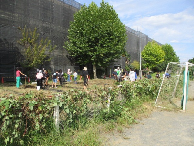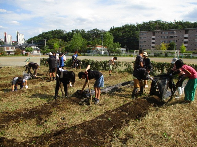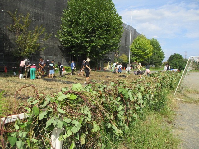 6年生が芋掘りの準備で、畑のさつま芋のつるを切って、マルチシートをはがしてくれました。