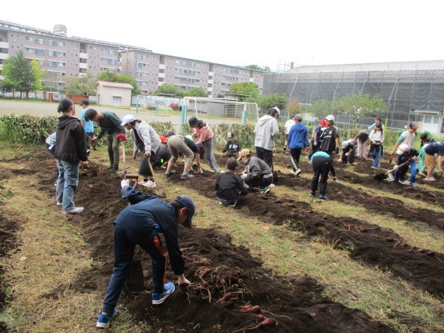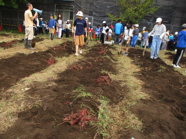 解散した後、5・6年生が掘り起こしたうねを平らにならして、掘り出したさつまいもを並べて天日干ししました。今年は小さいものが多いですが、合わせて何キロになるでしょう。