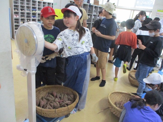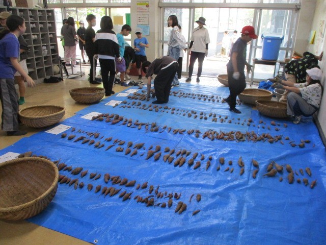 西昇降口のブルーシートの上に、各班のさつまいもを並べて、さらに収穫祭の前日まで干します。各班のかごの重さを量ったら4~6㎏の収穫でした。収穫祭での会食が楽しみです。