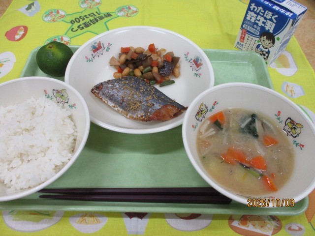 ごはん さごちの胡麻風味焼き 具だくさんのきのこ汁 五目煮豆 果物(みかん) 牛乳