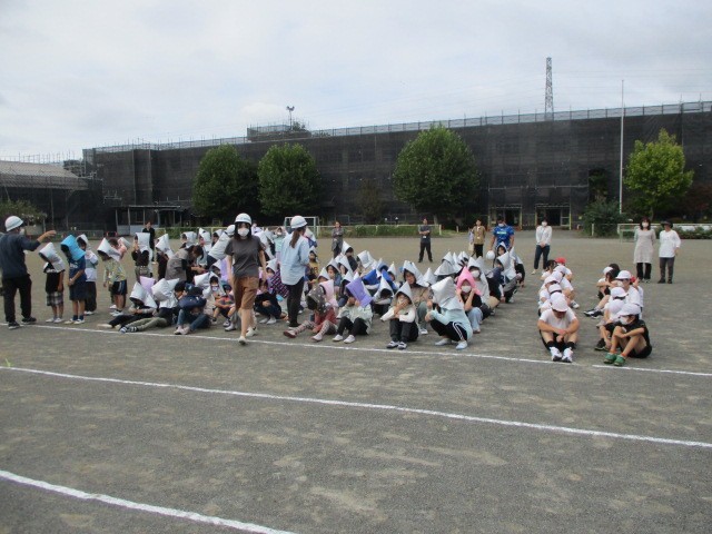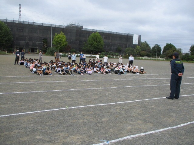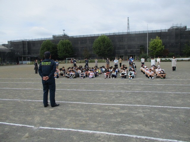 本日の避難訓練は地震と火事のため、家庭科室から出火の想定で行いました。校庭に避難完了後、八王子消防署由木分署の方に講評をいただきました。