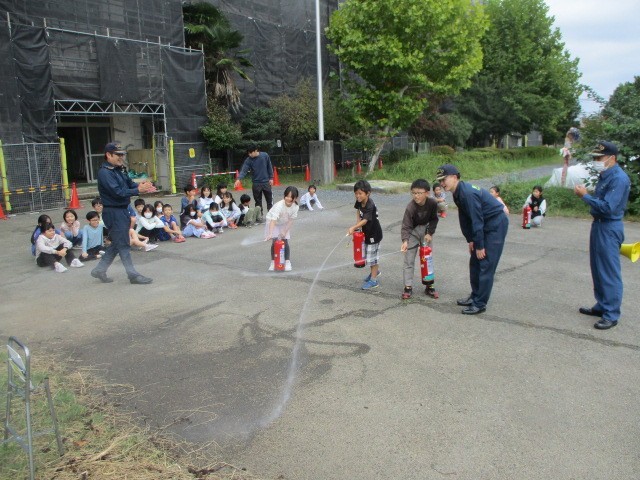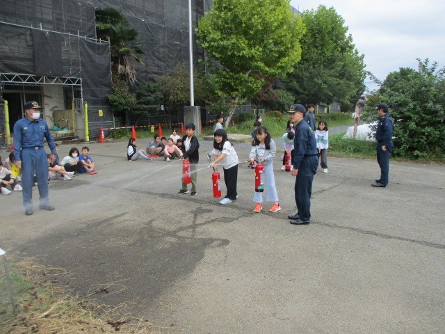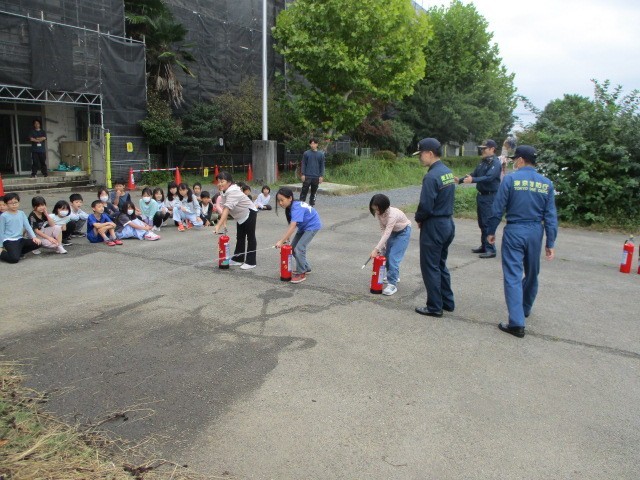 3年生は避難訓練の後、消火器を使った初期消火を体験しました。火事を発見して「火事だ!」と大きな声で人を呼び、消火器を持って運び、火に見立てた的をねらって放水しました。