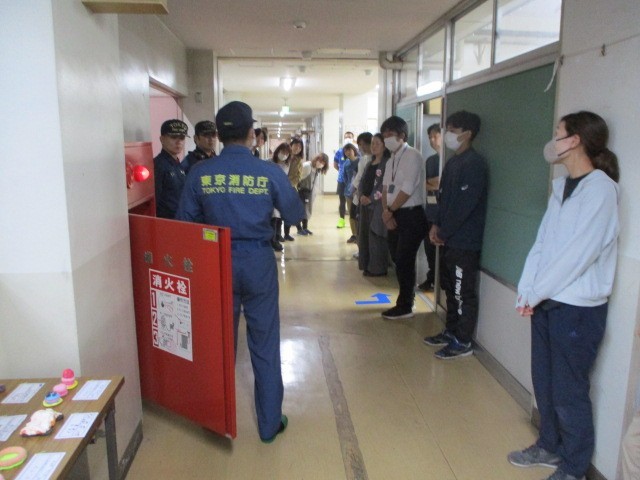 先生方も3年生に続いて、八王子消防署由木分署の方にお世話になって消火器訓練を行い、校舎内の消火栓の使い方も教えていただきました。
