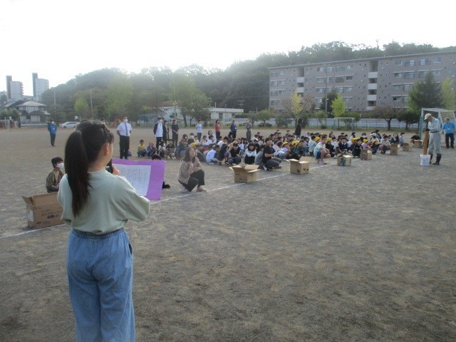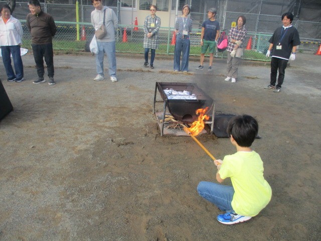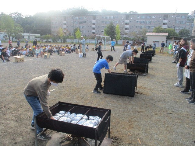 待ちに待った「収穫祭」の始まりです。収穫したサツマイモをかまに入れて、火が点火されました。