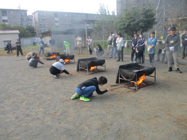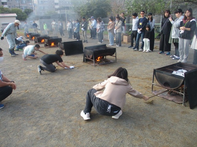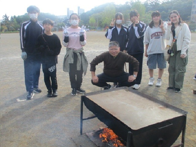 焼き芋の火の番に多くの保護者・地域の方々が朝早くから集まってくれました。ありがとうございました。松が谷中学校の生徒と校長先生も来てくれました。感謝です。