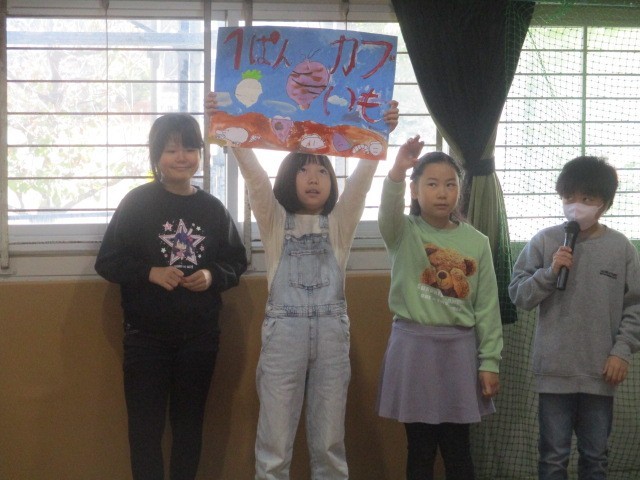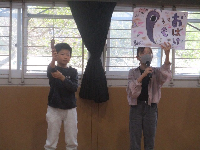 4年生は、恒例になった「おもしろいも」の発表です。