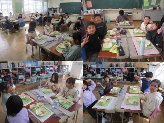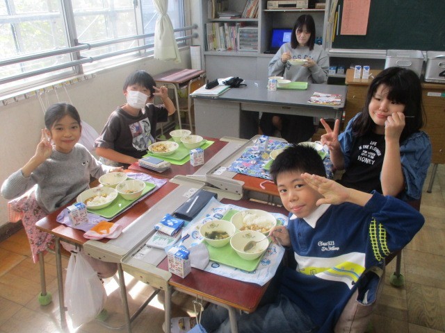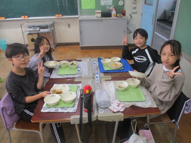 今日は、図書&給食のコラボメニューでした。マーボ豆腐丼に豆腐の汁物。豆腐メインの給食でした。みんな、おいしそうに食べていました。