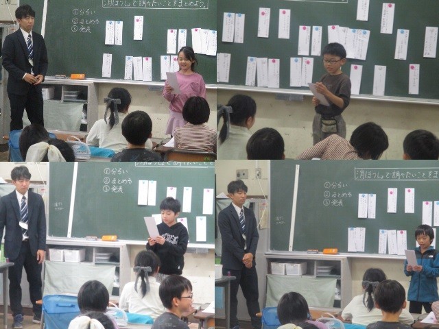 今年度の研究テーマ「思考・判断・表現力を高める指導 どの子も考え表現できる活動を通して」これを今回は、社会科で迫りました。明日、消防署見学をしますが、その時の質問内容を個人で考え、3人グループで相談し、学級でも分類しまとめました。みんな、よく授業に集中して、頑張りました。明日が、楽しみです。